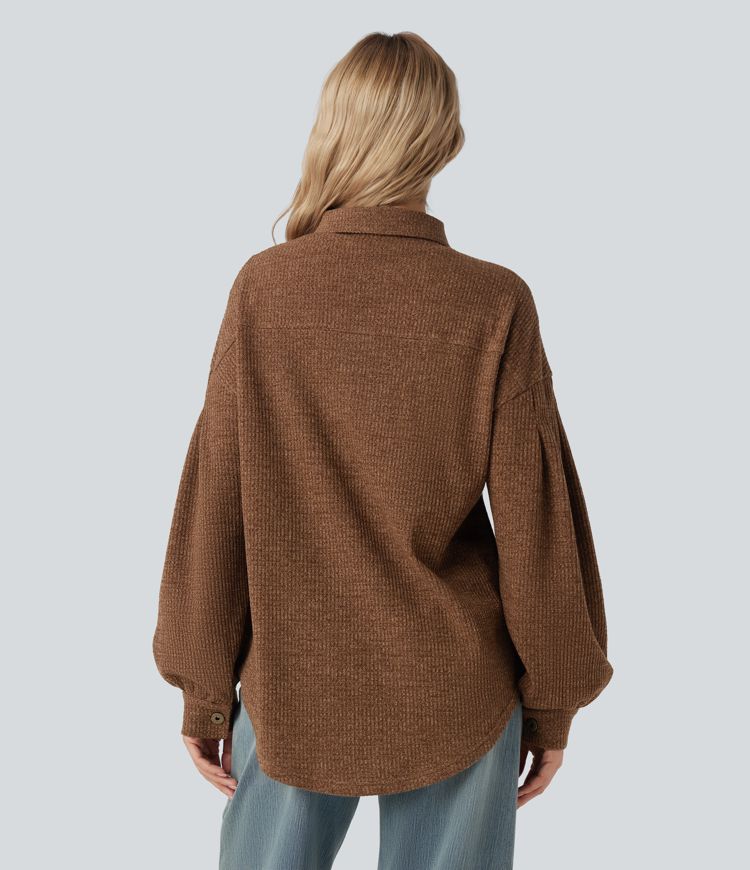 Long Sleeve Curved Hem Knit Waffle Casual Jacket with Pockets